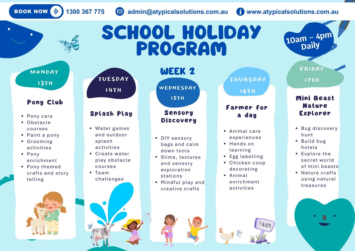 The Atypical School Holiday Program offers young people aged 5 – 18 years with disability a fun, supportive and engaging way to spend the school holidays. Based at Atypical Farm in Cranbourne South, our program provides a safe and inclusive environment where participants can build confidence, develop friendships and enjoy meaningful activities during the break from school.